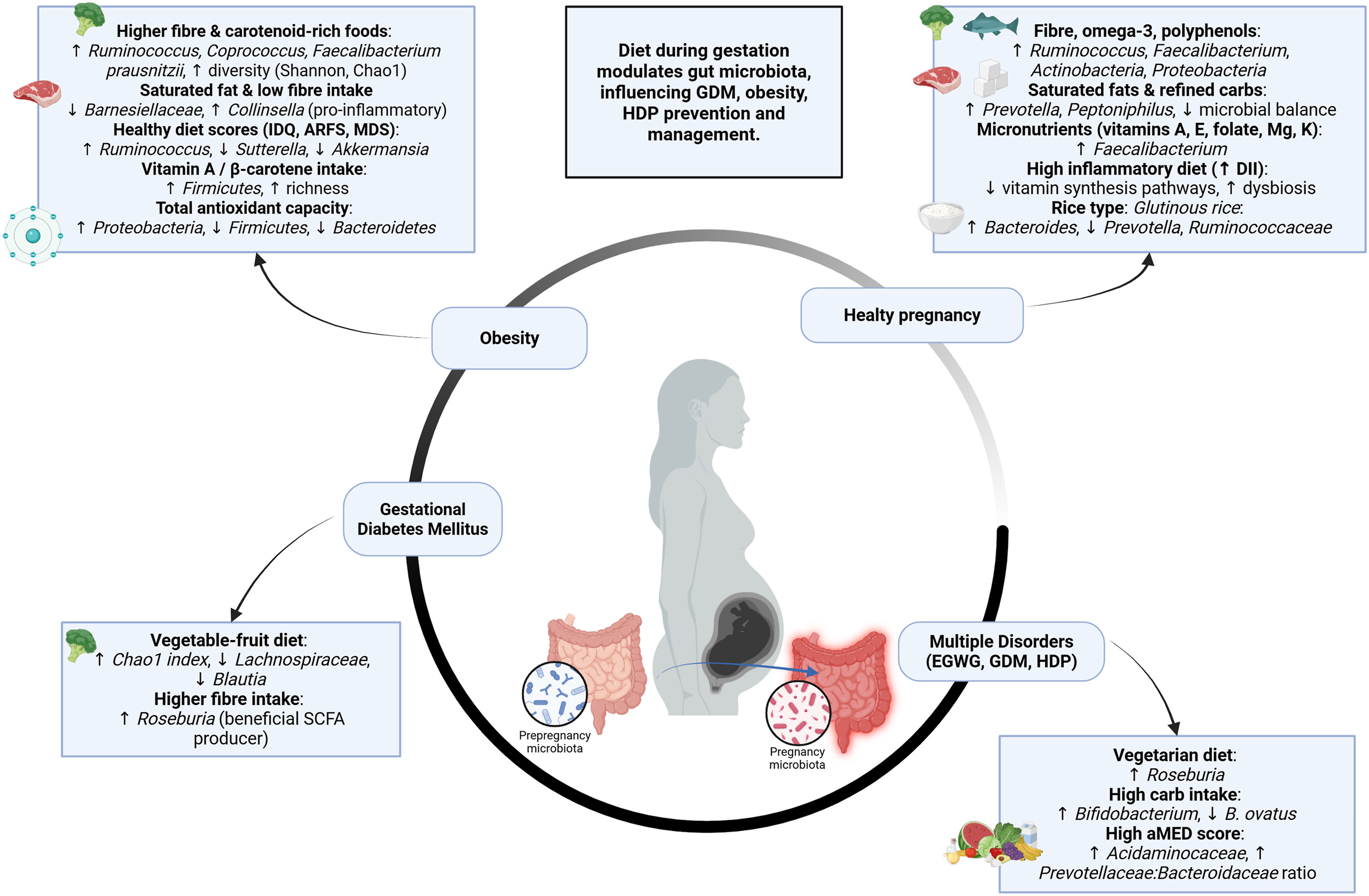 懷孕期間,孕婦的腸道菌相會自然發生極大的變化。如果飲食不當(例如常吃低纖維、高動物性脂肪的西式速食),易導致好菌減少、壞菌變多。這種「腸道菌相失衡」與多項嚴重的孕期併發症密切相關。相反地富含纖維的飲食能提供好菌所需的養分,幫助穩定血糖與調節免疫力