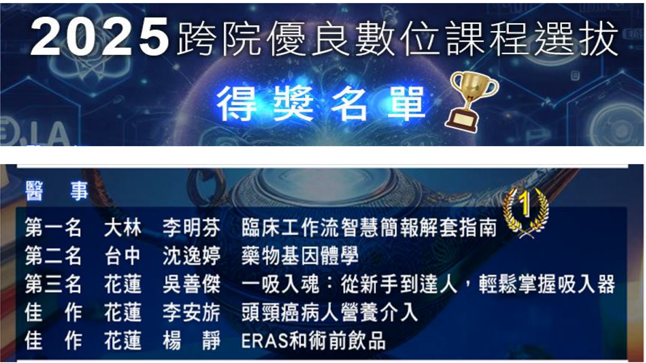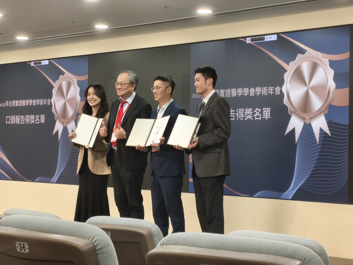第一名內科部裘亮德醫師、藥學部何振珮藥師、營養科紀凱勻營養師