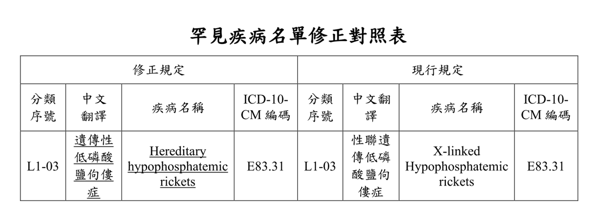 中華民國114年10月20日以衛授國字第1140463341號公告告知修正罕見疾病名稱,將性聯遺傳低磷酸鹽佝僂症(X-linked Hypophosphatemic rickets)修正為遺傳性低磷酸鹽佝僂症(Hereditary hypophosphatemic rickets)。