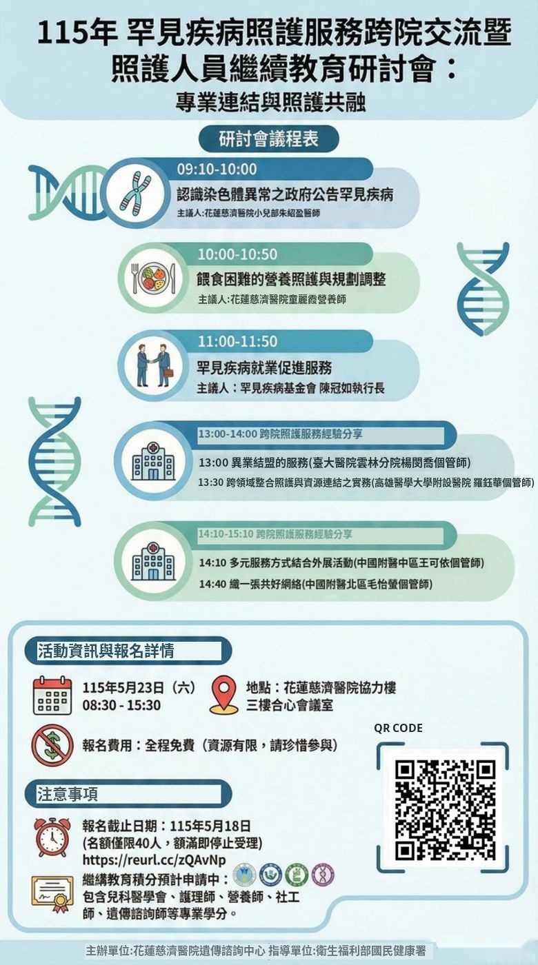 為提升罕見疾病個案生活品質,遺傳諮詢中心舉辦研習活動,邀請其他承辦衛生福利部罕見疾病照護服務計畫的院所,前來交流分享及討論照護經驗,歡迎所有對罕病照護有興趣的大眾踴躍報名!