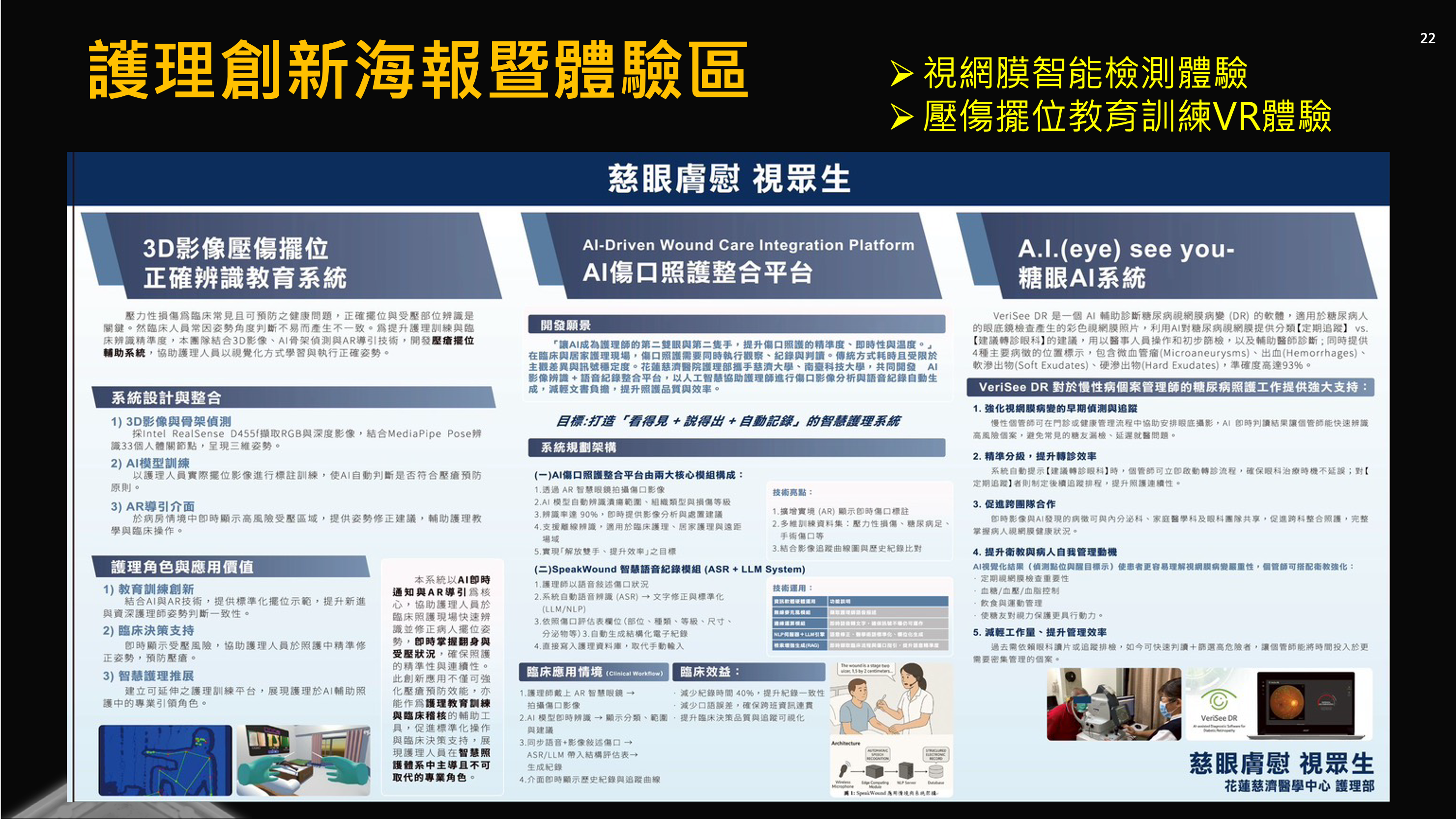 體驗區手診儀(N812)耳穴儀(N812)氣場儀(N812)視網膜智能檢驗(N812)壓傷擺位教育訓練VR體驗(N812)AR智能解說員(N812)VR髓緣元宇宙(N812)人體解剖模擬(I1115a)超音波檢驗操作(I1115a)人體構造系統一探(I1115a)找出病變的組織(I1115a)歡迎親臨體驗!