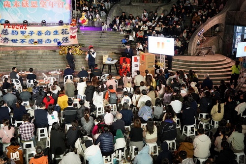 隨著夜幕低垂,投影幕播放起由公共傳播室製作的「守護四十・幸福顯影拍對」活動影片。公傳室於1月22日、23日特別在院內架設攝影棚,讓全院同仁都有機會可以體驗專業棚拍,留下屬於花蓮慈院四十歲的珍貴畫面。拍攝完成的照片不僅現場沖洗、讓同仁帶回珍藏,也會另外印製一份邀請大家簽名,作為飽含心意的禮物送給 上人。當畫面中一對對在醫院並肩打拼的夫妻同仁出現在螢幕上,大家都忍不住直呼「太幸福啦~」。感動尚未消散,緊接著播放了2025年度回顧影片,細數醫院這一年來在各領域的成長與累積的成果。