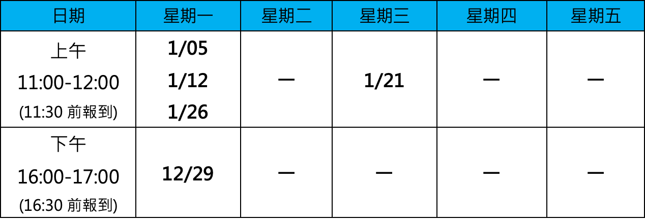 115/1/5(一)、1/12(一)、1/21(三)、1/26(一)