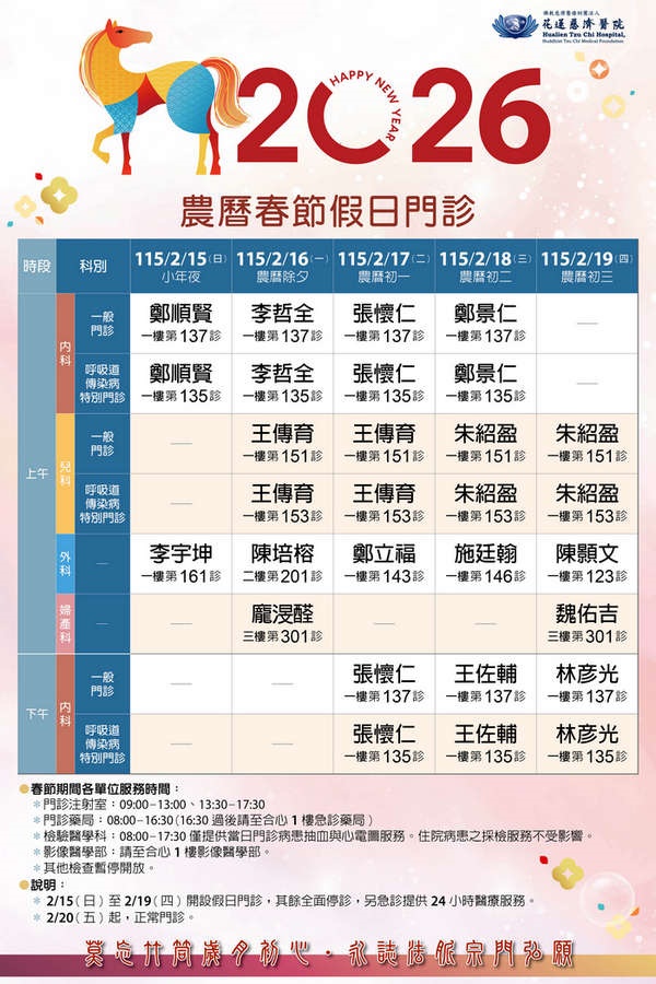 春節連續假期將至,花蓮慈濟醫院延續往年門診服務,自2026年2月15日(小年夜)起到19日(年初三)開設春節假日門診,兒科、內科、外科、婦產科及呼吸道傳染病疫情特別門診服務;此外,春節期間急診提供24小時醫療服務。各醫療科門診將在2月20日(年初四)恢復正常門診。