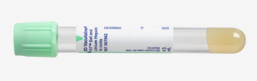 血清(SST Tube 桔黃管)、血漿(Heparin淡綠管)。 幼兒或困難抽血者檢體量1 mL以下者,請用特殊容器 Heparin Microtainer (綠色小試管)。檢體應避免溶血。 |