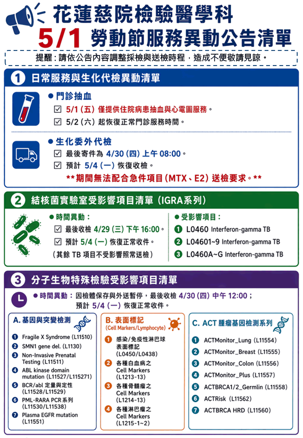 公告編號13:國定假日5/1(五)勞動節檢驗醫學科服務異動