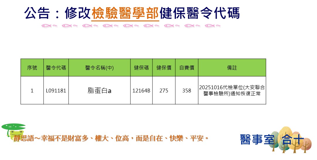 公告編號22:修改【檢驗醫學部】健保醫令代碼「L091181 脂蛋白a」
