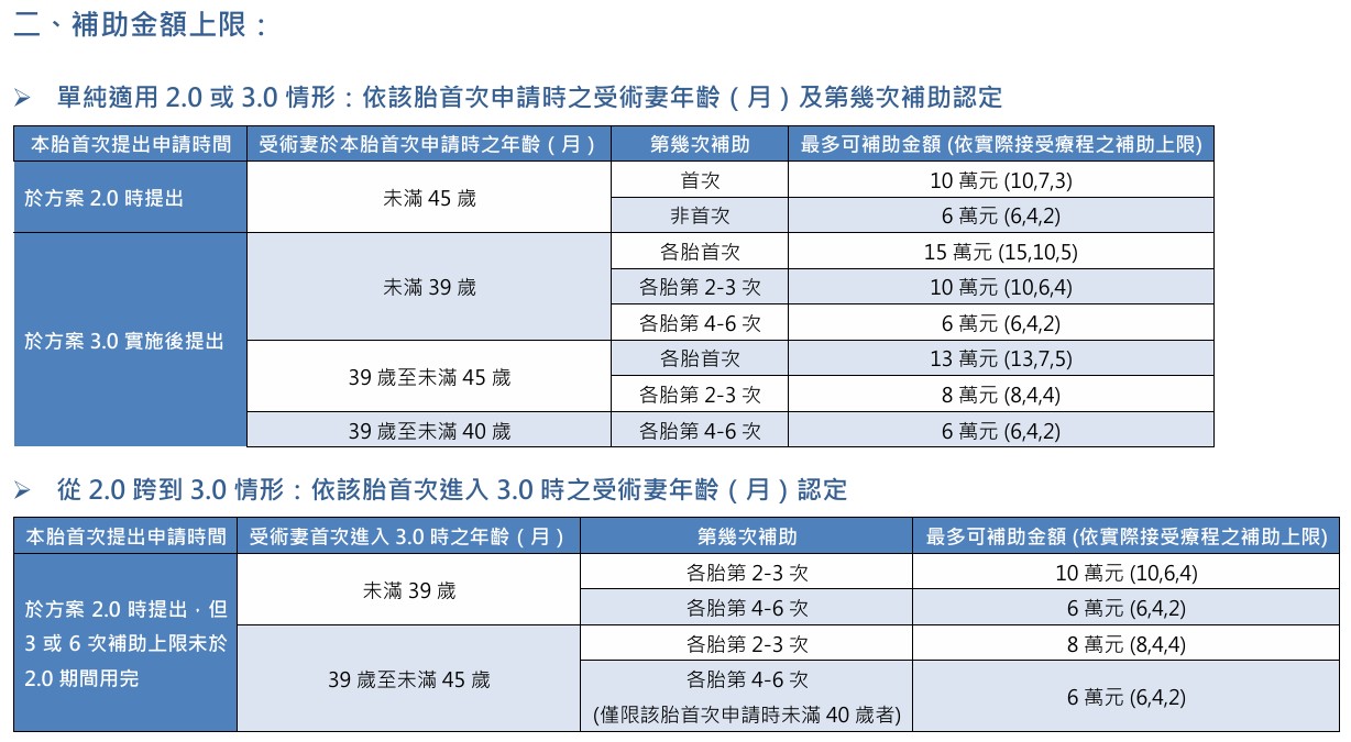 (二)依各胎首次申請時受術妻年齡、申請次數、施術方案給予不同補助額度,補助金額調整重點如下: