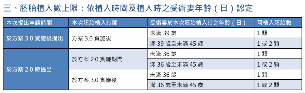 4.未滿39歲受術妻植入2個(含)以上胚胎;已滿39歲之受術妻植入3個(含)以上胚胎。