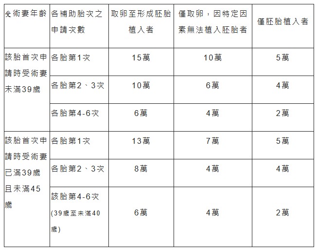 2、受術妻未滿39歲,各胎首次申請最高補助15萬元;受術妻滿39歲且未滿45歲,各胎首次申請最高補助13萬元。