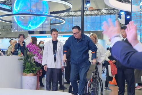 右圖:洺哲4日於台灣醫療科技展上自行由輪椅站起,展現一路以來花蓮慈濟醫院醫療團隊與他共同努力的奇蹟成果。