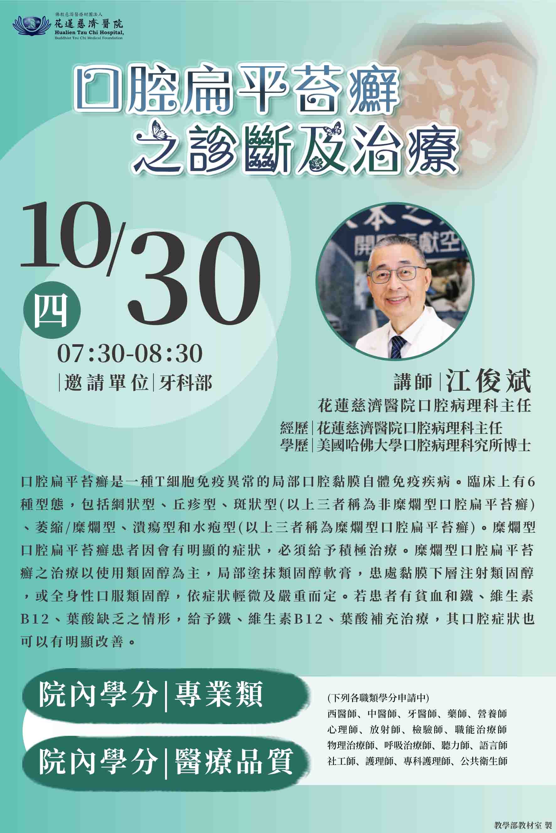 25 九,2025 最新消息 114.10.30 全院學術演講-口腔扁平苔癬之診斷及治療-江俊賓主任 下一篇文章: 114.10.23 全院學術演講-參加美國臨床研究受試者保護評鑑協會 經驗分享-謝燦堂委員 下一頁